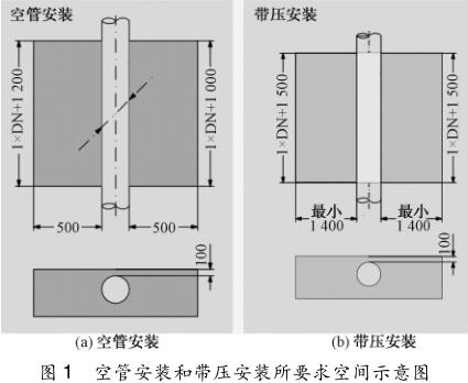 (1)要確認(rèn)在用液體流量計的管壁厚度及內(nèi)襯材料特性,保證換能器在管段內(nèi)壁的突出長度;(2)用氣焊切割液體流量計外殼時,一定要在管道內(nèi)充滿水的情況下(*好是帶壓并繼續(xù)保持管內(nèi)水在運行流動的狀態(tài))進行,以免內(nèi)襯受熱凸起變形影響流態(tài);(3)要有足夠安裝空間(流量井),可以用原有的流量井,但管壁與流量井墻壁*小距離不小于 500 mm,流量井長不小于 1. 5 倍管徑。超聲波流量計空管安裝和帶壓安裝要求空間如圖 1 所示。