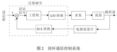 通信控制系統(tǒng)由工控機(jī)、變頻器、水泵、數(shù)據(jù)采集卡、煤油流量計(jì)等組成。在整個熱量表耐久性試驗(yàn)裝置中,煤油流量計(jì)與被試驗(yàn)熱量表串聯(lián)在試驗(yàn)管路中。系統(tǒng)設(shè)定流量值 qs,通過工控機(jī)發(fā)送信號給變頻器,來控制水泵運(yùn)轉(zhuǎn),系統(tǒng)通過研華數(shù)據(jù)采集卡 PCI1711 將采集到的煤油流量計(jì)當(dāng)前瞬時流量值反饋給工控機(jī),工控機(jī)將返回流量值與設(shè)定流量值qs進(jìn)行比較,從而確定是否需要重新調(diào)整變頻器頻率控制水泵轉(zhuǎn)速。此過程是一個完整的閉環(huán) PID 控制過程,其閉環(huán)控制過程如圖 2 所示。 2. 2 管路切換系統(tǒng)管路切換主要由冷熱水箱、水泵、開關(guān)閥等組成。要實(shí)現(xiàn)熱量表耐久性 4000 次冷熱沖擊試驗(yàn),需要實(shí)時控制管路中熱水與冷水的交替使用。
