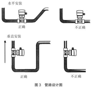 現(xiàn)場(chǎng)安裝時(shí)應(yīng)注意遠(yuǎn)離可能對(duì)其產(chǎn)生干擾的大型設(shè)備,防止長(zhǎng)期的熱輻射和其他如磁場(chǎng)直射等環(huán)境影響。為確保高測(cè)量精度和較好的零點(diǎn)穩(wěn)定性,進(jìn)行校正前,航空煤油流量計(jì)應(yīng)裝入工藝介質(zhì)中至少 24 小時(shí)電*鈍化。安裝的管路設(shè)計(jì)應(yīng)確保管道始終充滿流體,防止測(cè)量誤差,管路設(shè)計(jì)圖見(jiàn)圖 3。