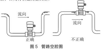 測(cè)量流向取決于航空煤油流量計(jì)的安裝方位,將航空煤油流量計(jì)在接頭上旋轉(zhuǎn) 180 度即可反向。正流向時(shí),航空煤油流量計(jì)的突耳應(yīng)在上游方向。流量顯示總是正的,而累加器可以根據(jù)流向增加或者減少。安裝中確認(rèn)管路設(shè)計(jì)不允許在介質(zhì)中產(chǎn)生氣泡或空腔,否則將引起測(cè)量誤差(見(jiàn)圖 5)。