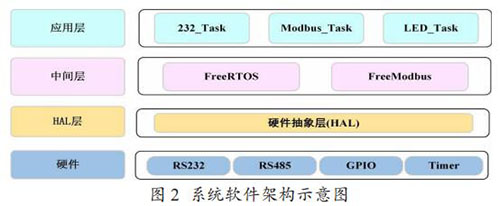 Modbus 通訊模塊的軟件架構(gòu)如圖 2 所示,分為硬件層、硬件抽象層,中間層和應(yīng)用層。中間層包括一個(gè)實(shí)時(shí)操作系統(tǒng)FreeRTOS 和一個(gè)針對嵌入式環(huán)境開發(fā)的輕量級 Modbus 協(xié)議庫Freemodbus。在應(yīng)用層,主要?jiǎng)?chuàng)建了三個(gè)任務(wù),232_Task 負(fù)責(zé)讀 取和解析流量計(jì)表頭輸出的文本信息,Modbus_Task 負(fù)責(zé)存儲 解析后的流量計(jì)數(shù)據(jù)到 Modbus 寄存器表,以及以 Modbus 協(xié)議與取水監(jiān)測設(shè)備通信,LED_Task 是一個(gè)輔助任務(wù),主要用來提示程序運(yùn)行狀態(tài)。