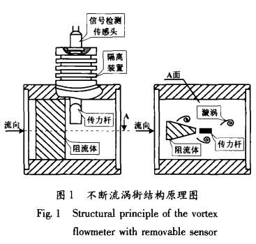 不斷流渦街同樣是以卡門渦街原理為依據(jù)測量流體流速的,但不斷流渦街表體已經(jīng)在結構上有了質的改變。如圖1所示,它將普通渦街單一的信號檢測傳感頭改變?yōu)閭髁U與信號檢測傳感頭兩部分,并通過隔離裝置完全隔離。當表體中流過流體并產(chǎn)生漩渦時,由傳力桿檢測漩渦的變化,并以力的形式傳遞給信號檢測傳感頭,完成了力信號到電信號的轉換過程。雖然傳力桿與流體直接接觸,但其本身只是進行力傳輸?shù)母軛U,因此,只對外形尺寸及鋼材選擇上具有要求。而信號檢測傳感頭是通過隔離裝置與流體完全密閉隔離的,再加上隔離裝置本身具有的散熱功能,使得信號檢測傳感頭的使用溫度要遠遠低于流體的實際溫度,從而有效地提高了普通信號檢測傳感頭的可測介質溫度。同時,不斷流渦街在進行維修更換信號檢測傳感頭時,并不影響工藝管道內流體的流動,真正實現(xiàn)了信號檢測傳感頭的不斷流拆裝維護。