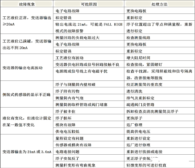 輸出電流一直為*小值,有可能是浮子卡死在底部,或者浮子泄露,與工藝聯(lián)系停表拆卸檢查,檢查測量桿內(nèi)及浮子上是否有污物,進(jìn)行清洗,如果浮子已泄露只能更換。