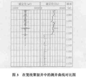 圖3是在中31- PXX籠統(tǒng)聚驅(qū)井中的測井曲線。測試條件是井內(nèi)既有油管又有套管。在1124m以上是內(nèi)徑為62mm油管段 ,以下是內(nèi)徑為124.6mm的套管段,儀器居中測井。左側(cè)是原磁性定位曲線,在油管段測速是900m/h,曲線有部分干擾;在套管段測速是90m/h,接箍曲線幅度低,部分接箍不能確定其具體位置。右側(cè)是更換后的接箍曲線,測井速度 100m/h,在油管段由于管柱內(nèi)徑小,曲線整體幅度高,接箍顯示清楚,1113m~1115m之間是封堵器,1124m處是油管喇叭口;在套管段由于管柱內(nèi)徑大,曲線整體幅度低,接箍顯示清楚。圖中不僅清楚地顯示出油管和套管的接箍位置,而且還能通過管柱內(nèi)徑的變化反映出不同的管柱結(jié)構(gòu)。
