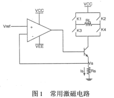 以往的激磁電路的設計都是采用恒流源和可控開關(guān)電路組成。恒流源是由電壓基準、比較放大、控制調(diào)整和采樣等部分組成的直流負反饋自動調(diào)節(jié)系統(tǒng),常用的激磁電路就是用串聯(lián)調(diào)整型恒流電源盒控制開關(guān)組成的,如圖1。其中Vref是參考電壓,Rs是采樣電阻,Is為流過Rs的電流,就是所需的恒流,RL為電磁流量傳感器線圈,K1、K2、K3、K4為可控開關(guān),以達到使線圈RL中流經(jīng)正負交換的電流,對傳感器激磁。