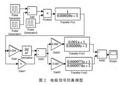 本文基于 Matlab 中 Siumlink 對電*信號進(jìn)行仿真,勵磁方式為三值波勵磁,勵磁頻率 f=25Hz,傳感器參數(shù) D=40mm、Rx=88.8Ω、Lx=162mH,勵磁系統(tǒng)參數(shù) Ue=100V、穩(wěn)態(tài)電流 I0=200mA。基于電*測量回路搭建的仿真模型如圖 2 所示,圖中信號模塊 pulsGenerator 通過加法器、乘法器得到勵磁電流。由公式(1),在固定流速下感應(yīng)電勢與勵磁電流成正比,通過增加 Gain1 模塊得到感應(yīng)電勢信號。 對勵磁電流進(jìn)行求導(dǎo)即經(jīng)模塊 Derivative 得到微分噪聲, 其中 Gain 值與 Lx 和 L1 相關(guān)。 感應(yīng)電勢與噪聲經(jīng)Add1 疊加之后得到電*信號 E1(t)。 scope 觀察輸出信號波形。仿真波形和真實波形如圖 3 所示。 將傳感器參數(shù)代入到勵磁電流穩(wěn)態(tài)調(diào)節(jié)時間公式中,得電流上升時間為 360μs,測得實際上升時間為 390μs,兩者相差不大,驗證了仿真模型的正確性。