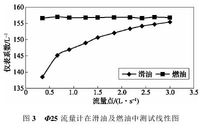 依據(jù)表3測(cè)試數(shù)據(jù),經(jīng)計(jì)算可得,Φ25流量計(jì)在滑油及燃油中測(cè)試結(jié)果如表4所示,測(cè)試線(xiàn)形圖如圖3所示。