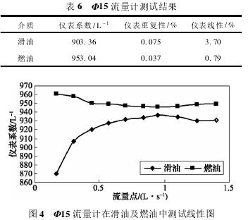 依據(jù)表5測(cè)試數(shù)據(jù),經(jīng)計(jì)算可得,Φ15流量計(jì)在滑油及燃油中測(cè)試結(jié)果如表6所示,測(cè)試線(xiàn)性圖如圖4所示。
