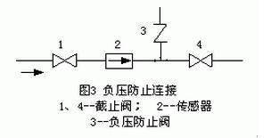 氟塑料襯里傳感器須謹(jǐn)慎地應(yīng)用于負(fù)壓管系;正壓管系應(yīng)防止產(chǎn)生負(fù)壓,例如液體溫度高于室溫的管系,關(guān)閉傳感器上下游截止閥停止運行后,流體冷卻收縮會形成負(fù)壓,應(yīng)在傳感器附近裝負(fù)壓防止閥,如圖3所示。有制造廠規(guī)定PTFE 和PFA 塑料襯里應(yīng)用于負(fù)壓管系的壓力可在200C、1000C、1300C時使用的絕對壓力必須分別大于27、40、50KPa。