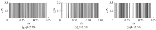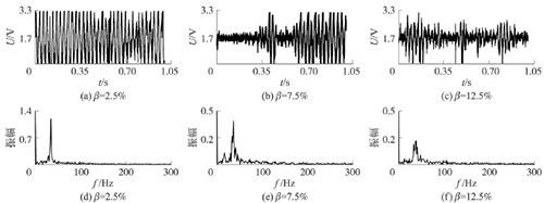 試驗(yàn)發(fā)現(xiàn),氣相的加入對(duì)過熱蒸汽流量計(jì)測(cè)量的影響顯著,譜分析和脈沖計(jì)數(shù)兩種方法隨著氣相注入的增加其表現(xiàn)也不同。圖4反映了水流量12m3/h時(shí),注入不同氣含率β時(shí)A點(diǎn)的模擬信號(hào),如圖4(a~c)所示;經(jīng)譜分析后得到的頻率值,如圖4(d~f)所示;用脈沖計(jì)數(shù)方法得到的脈沖信號(hào),如圖4(g~i)所示。圖4顯示,當(dāng)注入氣量不大時(shí),對(duì)過熱蒸汽流量計(jì)的影響不大,無論是譜分析結(jié)果還是脈沖計(jì)數(shù)得到的結(jié)果都比較好。當(dāng)注入的氣量進(jìn)一步增加時(shí),渦街原始信號(hào)強(qiáng)度和穩(wěn)定性逐漸變差,渦街頻率信號(hào)會(huì)被干擾信號(hào)所淹沒,反映到譜分析圖是,渦街頻率的譜能量減小,干擾信號(hào)的譜能量加強(qiáng);對(duì)于脈沖信號(hào),會(huì)因?yàn)橐恍┬郎u信號(hào)減弱,形成脈沖缺失現(xiàn)象,而不能真實(shí)地反映渦街產(chǎn)生的頻率。