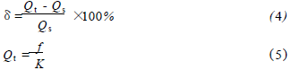 將過熱蒸汽流量計(jì)在標(biāo)準(zhǔn)水裝置上,分別用頻譜分析和脈沖計(jì)數(shù)的方法進(jìn)行標(biāo)定,流體介質(zhì)為水未加氣體,采用的標(biāo)準(zhǔn)傳感器為精度等級(jí)為0.2級(jí)的電磁流量計(jì)。在每個(gè)流量測(cè)量點(diǎn)上的儀表系數(shù)用公式(1)計(jì)算,然后用式(2)計(jì)算得到*終儀表系數(shù)K。Ql為被測(cè)水的流量值,f為每一個(gè)流量點(diǎn)得到的頻率,k為每個(gè)測(cè)量點(diǎn)得到的儀表系數(shù)。kmax、kmin分別為試驗(yàn)流量范圍內(nèi)得到的*大與*小的儀表系數(shù)。儀表系數(shù)的線性度E1用式(3)來計(jì)算。