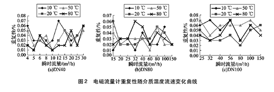 將實(shí)驗(yàn)測(cè)得的水處理流量計(jì)在不同溫度及流速下的重復(fù)性數(shù)據(jù)整理,特性曲線如圖2所示,3組曲線分別對(duì)應(yīng)DN40, DN80, DN100的3塊水處理流量計(jì)的重復(fù)性曲線。