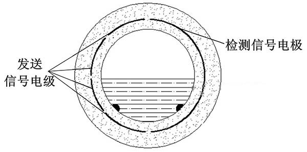 ③利用阻抗或信號衰減研制的非滿管管道式電磁流量計。這種結(jié)構(gòu)的非滿管管道式電磁流量計是當(dāng)前國內(nèi)研究的方向之一。其結(jié)構(gòu)是流量管底部貼一對信號發(fā)射電*,在流量管中間貼信號接收電*。由于信號在流體中傳播會產(chǎn)生衰減,且傳播時間越長,衰減越多,因此通過信號接收電*接收到的信號衰減量即可得知液面高度;同時該電*還能測量流體切割磁感線產(chǎn)生的電動勢,以此達(dá)到測量非滿管流量的目的。阻抗式或信號衰減非滿管管道式電磁流量計結(jié)構(gòu)簡圖如圖5所示。