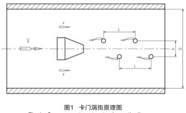 插入式煙氣流量計(jì)實(shí)現(xiàn)流量測(cè)量的理論基礎(chǔ)是流體力學(xué)中**的“卡門(mén)渦街”原理,在流動(dòng)的流體中裝置一個(gè)非線(xiàn)性三角柱形體,即渦旋發(fā)生體,如圖 1 所示。當(dāng)流體沿渦旋發(fā)生體繞流時(shí),會(huì)在渦旋發(fā)生體下游產(chǎn)生兩列不對(duì)稱(chēng),但有規(guī)律交替地分離釋放出一系列漩渦束,只有當(dāng)兩渦漩列之間的距離 h 和同列的兩渦漩之間的距離 L 之比滿(mǎn)足 h/L=0.281 時(shí),所產(chǎn)生的渦街才是穩(wěn)定的。