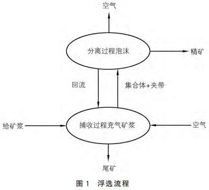 浮選是依據(jù)礦物原料表面的化學(xué)性質(zhì),向待浮選的礦漿中加入浮選藥劑和空氣,使其與礦漿充分融合,并根據(jù)各礦物原料的黏附程度的不同,分選出不同的礦物。浮選過程一般分為礦漿碰撞、黏附、上浮以及精煤溢出四個(gè)階段。礦物原料在浮選藥劑的作用下,與 空氣發(fā)生器產(chǎn)生的小氣泡發(fā)生充分碰撞,進(jìn)行礦物捕集。利用礦物間的疏水特性,礦物粘附于氣泡表面,氣泡不斷上浮,形成精礦泡沫層,精礦溢出浮選柱;由于尾礦的親水特性,尾礦沉入底部并排出。浮選流程如圖1所示。