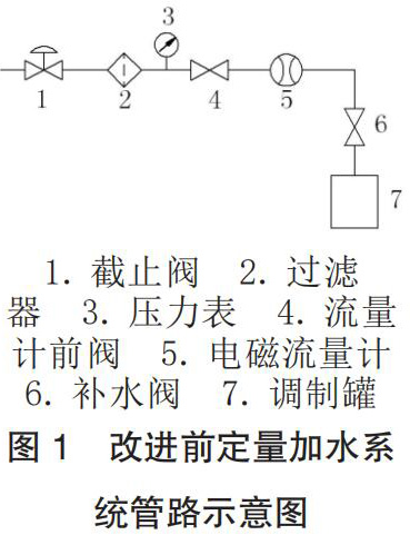 工廠的香料廚房系統(tǒng)為國(guó)內(nèi)煙機(jī)公司 2004 年設(shè)計(jì)制造,其定量加水系統(tǒng)主要由水源、生活污水流量計(jì)、加水管路元件和控制程序這四部分組成,改進(jìn)前管路示意圖如圖 1 所示。
