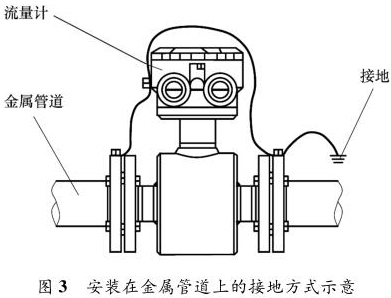 智能型防腐電磁流量計(jì)安裝在金屬管道上,安裝時(shí)將金屬管道與智能型防腐電磁流量計(jì)相連接,接地線(xiàn)再接入接地網(wǎng),如圖 3 所示。