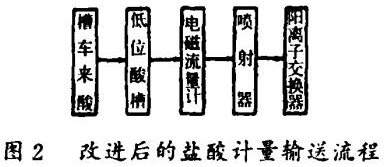 該系統(tǒng)工藝復(fù)雜,操作困難,安全性低,在一次向高位酸槽壓送濃鹽酸的過程中,曾發(fā)生過鹽酸噴出傷人的事故。因此對整個系統(tǒng)進行了改進(見圖2)