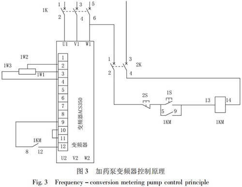 STD - Ⅲ型浮選工藝參數(shù)自動測控系統(tǒng)通過雙膜盒差壓計測量原礦漿濃度; 采用插入式電磁流量計測量原礦漿流量,由 PLC 計算出入浮干煤泥量和藥劑的瞬時添加量,用變頻式計量泵完成浮選藥劑的添加。通過上位機還可以打印小時、班、天及月的運行數(shù)據(jù),更加有利于生產(chǎn)管理及技術分析,藥劑自動原理如圖 2 所示,k1、k2、k3 是計算修正參數(shù)。以 PID 算法為核心,通過優(yōu)化控制程序計算出藥劑給定量,在捕收劑和起泡劑管道上分別安裝藥劑測量裝置,用于檢測藥劑的添加量。當藥劑測量值小于藥劑給定量時,PID 輸出增大,反之則減小。加藥泵變頻器控制原理如圖 3 所示。