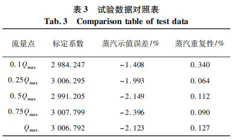 測試對(duì)象為同一臺(tái)表,DN80 口徑,帶有在空氣標(biāo)定裝置上的 5 點(diǎn)標(biāo)定系數(shù)。將管道介質(zhì)設(shè)定為過熱蒸汽,并預(yù)設(shè)溫度為 160 ℃ 和壓力 0. 4 MPa,以便儀表計(jì)算過熱蒸汽的密度。試驗(yàn)數(shù)據(jù)對(duì)照如表 3 所示。