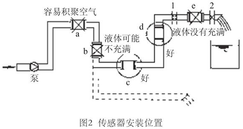 液體流動方向必須與傳感器殼體上箭頭方向一致。對于能正反向測量的液氮流量計,若方向不一致雖仍可測量,但設定的顯示流動正反方向不符,必須改正之。若拆傳感器工作量大,也可改變傳感器上箭頭方向和重新設定顯示儀表符號。管道未充滿液體主要是管網(wǎng)工程設計或傳感器安裝位置不妥,使傳感器測量管內(nèi)不能充滿液體。應采取措施,避免安裝如圖2所示a,e位置和以虛線管排放時b位置,改裝到c,d位置。