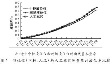 液位的測(cè)量是整個(gè)容積法校驗(yàn)的重點(diǎn),其準(zhǔn)確度直接關(guān)乎計(jì)量結(jié)果。由于液位儀信號(hào)非數(shù)字傳輸,在測(cè)量過程中安裝了人工標(biāo)尺這一液位簡(jiǎn)易測(cè)量裝置,供校核液位儀使用。將測(cè)量的累計(jì)液位差同液位儀(中控、現(xiàn)場(chǎng))測(cè)得數(shù)據(jù)進(jìn)行比較,如圖 1 所示。
