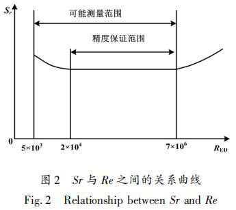 斯特勞哈爾數(shù) Sr 與雷諾數(shù) Re 之間的關(guān)系曲線如圖 2 所示。當(dāng)阻流體尺寸確定后