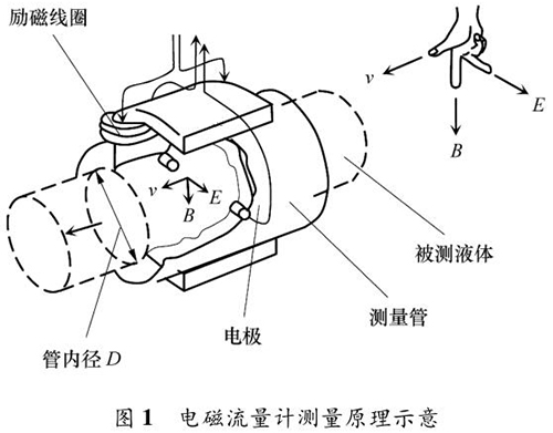 防腐型電磁流量計的測量原理如圖 1 所示。根據(jù)法拉*電磁感應定律,導電液體在磁場中流動會產(chǎn)生電動勢 E,它與磁感應強度 B、導電液體平均流速 v 成一定比例關(guān)系:
