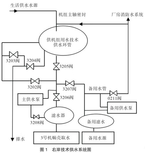 大化電廠技術(shù)供水包括右岸和左岸供水,本文以右岸 3 號(hào)機(jī)技術(shù)供水系統(tǒng)增設(shè)帶現(xiàn)場(chǎng)顯示航空煤油流量計(jì)技術(shù)改造方案為例進(jìn)行分析說(shuō)明。右岸技術(shù)供水系統(tǒng)(見(jiàn)圖 1)由各機(jī)組單元蝸殼取水主水源、濾水器、主供水泵、正反向切換閥(3202 閥與 3204 閥開(kāi)為反向取水,3203 閥與 3205閥開(kāi)為正向取水,運(yùn)行時(shí)只開(kāi)其中一種)、備用水源、備用濾水器、備用供水泵和備用總水管構(gòu)成一個(gè)整體,并通過(guò) 0211 閥與廠房消防水系統(tǒng)相連接,可通過(guò)主水源自流供水、主水源水泵增壓供水、備用水源自流供水、備用水源水泵增壓供水等不同供水方式向機(jī)組推力軸承冷卻器和發(fā)導(dǎo)軸承冷卻器、水導(dǎo)軸承冷卻器、發(fā)電機(jī)空氣冷卻器提供冷卻水源。機(jī)組技術(shù)供水正常運(yùn)行采用單元蝸殼取水的供水方式運(yùn)行,以備用水源供水為輔。機(jī)組主軸密封用水分別取自生活供水水源和技術(shù)供水備用總管水源,向機(jī)組大軸提供可調(diào)水壓端面密封水源。在現(xiàn)場(chǎng)配置一個(gè)技術(shù)供水現(xiàn)地單元柜,實(shí)現(xiàn)對(duì)機(jī)組技術(shù)供水系統(tǒng)設(shè)備自動(dòng)控制、故障保護(hù)及報(bào)警。柜內(nèi)配置可編程 PLC 控制系統(tǒng),電控柜對(duì)主供增壓泵、3202 至 3208 電動(dòng)碟閥進(jìn)行流程控制。