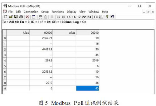 Modbus Poll 通訊測試結(jié)果如圖 5 所示:Tx = 24140,Err =0,ID = 1,F(xiàn) = 04,SR = 1000ms,Log = on。 其中 ,Tx 為Modbus Poll 發(fā)送命令次數(shù),也就是說在測試期間 Modbus Poll軟件共發(fā)送讀輸入寄存器命令 24140 次(發(fā)送間隔為 1s,測試時(shí)間為 6.7 小時(shí));Err 為通訊錯(cuò)誤數(shù),Err = 0 表明 Modbus 通訊模塊正確響應(yīng)次數(shù)為 24140 次(錯(cuò)誤數(shù)為 0)。