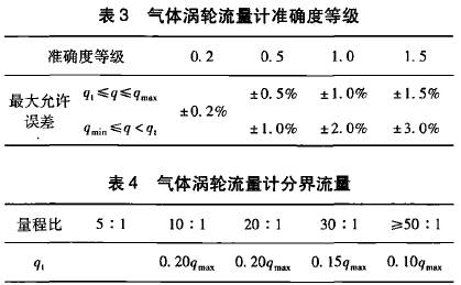 在GB21391--2008《用氣體渦輪流量計(jì)測(cè)量天然氣流量》對(duì)分界流量q,有明確的定義,即低于該流量要采用擴(kuò)展誤差限的流量值。標(biāo)準(zhǔn)*5.2條從*大允許誤差和量程比兩方面對(duì)分界流量做出了規(guī)定,且明確了量程比是在*大允許誤差范圍內(nèi)流量計(jì)的*小流量和*大流量之比。該標(biāo)準(zhǔn)中對(duì)渦輪流量計(jì)要求的*大允許誤差如表1所示,量程比與分界流量q,的關(guān)系如表2所示。
