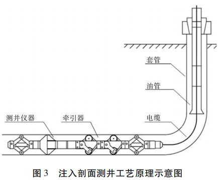 水平井注水井注入剖面測井工藝原理如圖 3 所示。在垂直井段,儀器在重力作用下可以通過注入管柱下入到井內(nèi),注入管柱下端須裝有喇叭口,且喇叭口應(yīng)在造斜點(diǎn)以上,保證測井完成后儀器順利起出,不發(fā)生卡儀器問題。儀器通過喇叭口以后在重力作用下繼續(xù)向下移動,當(dāng)儀器不能靠重力下移時,啟動牽引器,利用牽引器將儀器推送到井底,上提電纜過程中進(jìn)行測井。