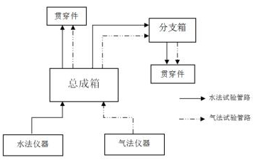 安全殼渦街蒸汽流量計(jì)以總成箱和分支箱為核心。試驗(yàn)初期,將總成箱置于儀器放置區(qū),分支箱置于貫穿件集中區(qū)域附近,檢漏儀至總成箱再至分支箱之間的管線固定連接,如圖2所示。水法試驗(yàn)管路與氣法試驗(yàn)管路互相獨(dú)立,總成箱和分支箱的每一路連接采用編號(hào)標(biāo)記進(jìn)行區(qū)分,并設(shè)置控制閥控制開(kāi)關(guān)和流向。