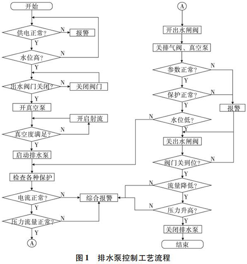 排水泵進(jìn)行自動(dòng)化控制模式后,當(dāng)水倉水位達(dá)到開泵要求,PLC 自動(dòng)檢測電動(dòng)閥門、球閥、供電電壓等是否正常后,啟動(dòng)真空泵進(jìn)行抽真空,當(dāng)水泵真空度符合開泵要求時(shí)便啟動(dòng)排水泵。排水泵正常運(yùn)轉(zhuǎn)后 PLC 時(shí)時(shí)收集運(yùn)行數(shù)據(jù)進(jìn)行比對,當(dāng)發(fā)現(xiàn)運(yùn)行數(shù)據(jù)比對出現(xiàn)差異時(shí)影響到排水泵正常運(yùn)轉(zhuǎn)時(shí),會(huì)發(fā)出停泵命令。排水泵控制工藝流程如圖 1 所示。