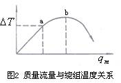 在總的熱傳導(dǎo)系數(shù)a中,因測量管壁很薄且具有相對較高熱導(dǎo)率,儀表制成后其值不變,因此a的變化可簡化認(rèn)為主要是流體邊界層熱導(dǎo)率的變化。當(dāng)使用于某一特定范圍的流體時,則a、cp均視為常量,則質(zhì)量流量僅與繞組平均溫度差成正比,如圖2 oa 段所示。 oa段為儀表正常測量范圍,儀表出口處流體不帶走熱量,或者說帶走熱量*微;超過a點(diǎn)流量增大到有部分熱量被帶走而呈現(xiàn)非線性,流量超過b點(diǎn)則大量熱量被帶走。