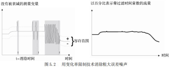 “變化率限制值”與“不敏感時間值”是用來消除某些增加阻尼不能除去的噪聲。它能夠從真實的流量信號中判別出階躍信號引起的噪聲和漿液尖狀噪聲。這種判別是以變化率的限制和持續(xù)時間為依據(jù)的。圖 5.2 所示為使用變化率限制技術(shù)去除粗大誤差的原理說明。該功能為在前面采樣中獲得的流量數(shù)據(jù)經(jīng)一階濾波后的,設(shè)定某一上限和下限(變化率)。如果當(dāng)前采樣的流量數(shù)據(jù)超過或低于這個*限值,而且在超過或低于這個*限值的變化時間之內(nèi),則認為這種變化是由于噪聲所引起的,CPU 予以切除;而當(dāng)超過或低于這個*限值的變化在設(shè)置的不敏感時間以外,則認為這種變化是由于真正的流量變化所引起,CPU 就認可是測量流量的變化。