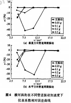 以應(yīng)力式模擬渦街流量計(jì)為被測(cè)對(duì)象,在5m/s、7.5m/s、11m/s、15.5m/s、20.5m/s流速下,分別進(jìn)行了無(wú)振動(dòng)和施加管道周期振動(dòng)的實(shí)流標(biāo)定試驗(yàn)。管道振動(dòng)方向?yàn)榇怪狈较蚝退椒较颍铀俣葹?.05-0.5g。根據(jù)試驗(yàn)數(shù)據(jù),繪制出不同管道振動(dòng)加速度下渦街儀表系數(shù)相對(duì)于無(wú)管道振動(dòng)時(shí)平均儀表系數(shù)的相對(duì)誤差曲線,垂直方向結(jié)果如圖3(a)所示。