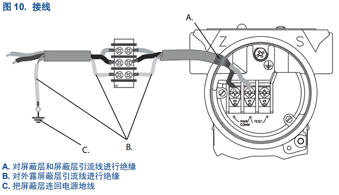 應(yīng)使用屏蔽雙絞線以獲得*佳效果。應(yīng)使用長度不超過 1500 米 (5000 英尺)的24 AWG 或更粗接線。根據(jù)實際情況,可在安裝接線時做一個滴水圈。滴水圈的布置應(yīng)保證其底部低于導(dǎo)線管接頭和變送器外殼。